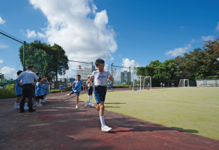 マイペースで楽しく、友だちや先生と一緒に10分ほど走ります。1年生は9月から仲間入り。